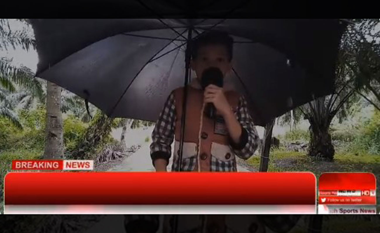 Dia dilihat sangat yakin sambil memegang mikrofon dan payung ditambah pula dengan hasil suntingan yang layak diberi pujian! Difahamkan, video berkenaan dirakam dengan bantuan ibu serta abangnya.
