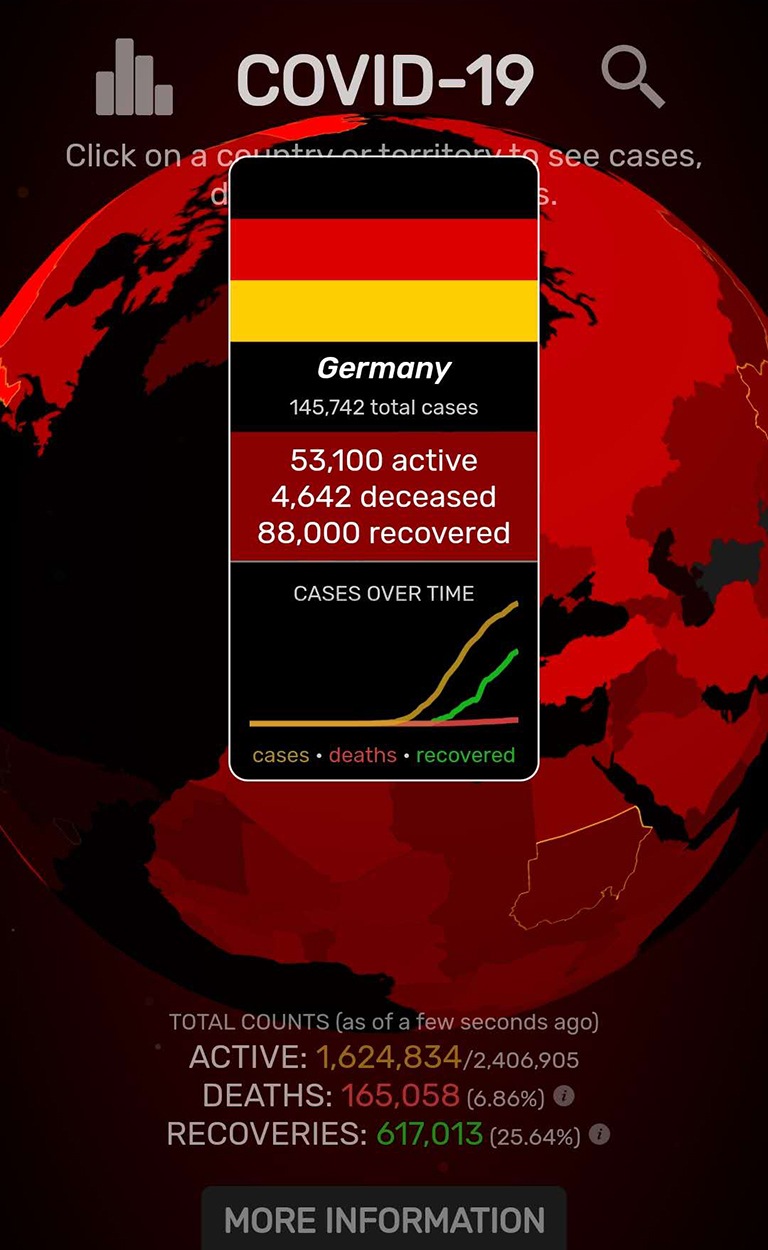 Negara German berada di nombor keempat yang paling tinggi kesnya. Walaupun negara ini berada di nombor keempat, mereka dapat mengawal keadaan di sana dengan pertolongan “smartwatch app” untuk memantau penyebaran Coronavirus.