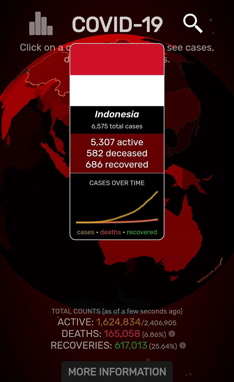 Negara Indonesia pula mempunyai nombor kes Covid-19 yang tak terkiranya. Berdasarkan governor Jakarta dan West Javahave mencadangkan bahawa bilangan orang yang dijangkiti virus ini lebih tinggi bilangannya dari akaun rasmi kerajaan pusat.