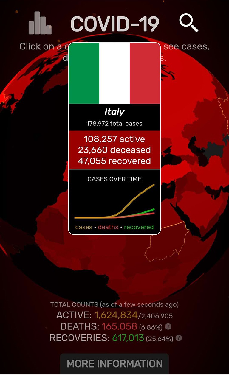 Seterusnya diikuti dengan negara Itali. Sebelum ini, negara ini mempunyai kes yang paling tinggi sebelum Amerika Syarikat. Dengan kawalan “lockdown” di negara ini, nombor kes Covid-19 terkawal. Akan tetapi, kesnya menaik perlahan jika dibandingkan pada hari pertama wabak ini meningkat.