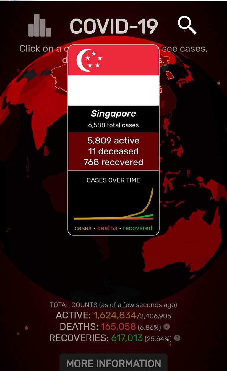 Di Singapura, kes Covid-19 menaik perlahan-lahan. Walaupun begitu, negara ini dikenakan “partial lockdown”. Sesiapa yang melanggar peraturan akan dikenakan bayaran 7,000 US Dollars atau penjara selama 6 bulan.