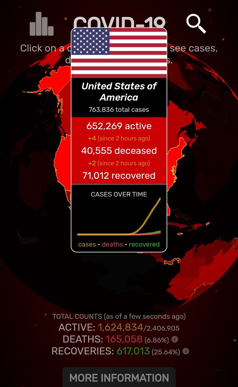Kes yang paling tinggi ialah di Amerika Syarikat. Mereka mempunyai kes yang paling tertinggi antara negara-negara yang lain. Berdasarkan CNN, Perdana Menteri Amerika, Donald Trump lambat dalam membuat kawalan pergerakan untuk rakyatnya. Jika beliau bertindak lebih awal, peningkatan kes boleh dikawal.